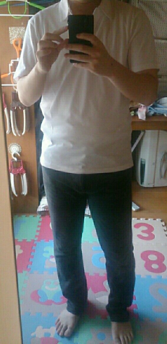 ポロシャツの着丈が長いのにデニムの細さが中途半端だからシルエットが全く整ってねえな
