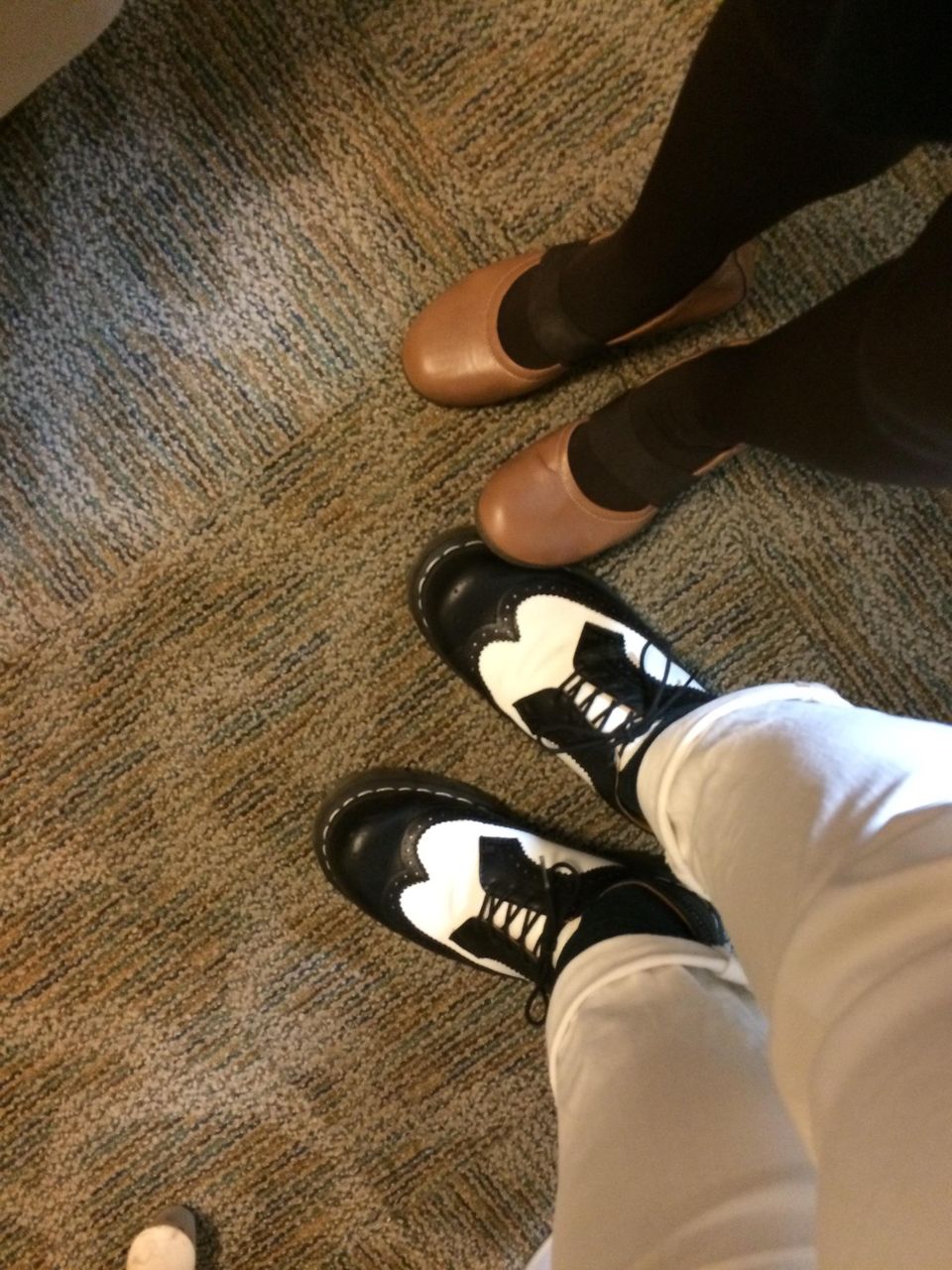 ジョージコックスは白だが、マーチンの10ホールは黒に白ひも、ウイングチップの黒×白、茶×白の2足